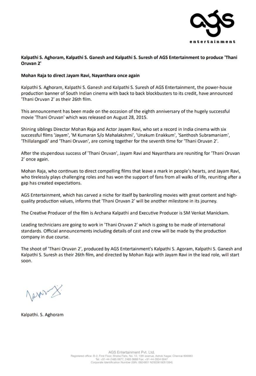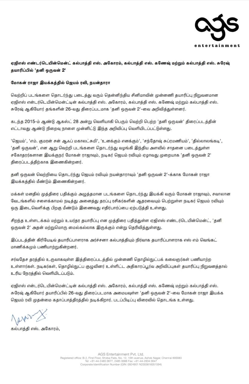 வெற்றிப் படங்களை தொடர்ந்து படைத்து வரும் தென்னிந்திய சினிமாவின் முன்னணி தயாரிப்பு நிறுவனமான ஏஜிஎஸ் என்டர்டெயின்மென்ட்டின் கல்பாத்தி எஸ். அகோரம், கல்பாத்தி எஸ். கணேஷ் மற்றும் கல்பாத்தி எஸ். சுரேஷ் ஆகியோர் தங்களின் 26-வது திரைப்படமாக ‘தனி ஒருவன் 2’-வை அறிவித்துள்ளனர்.