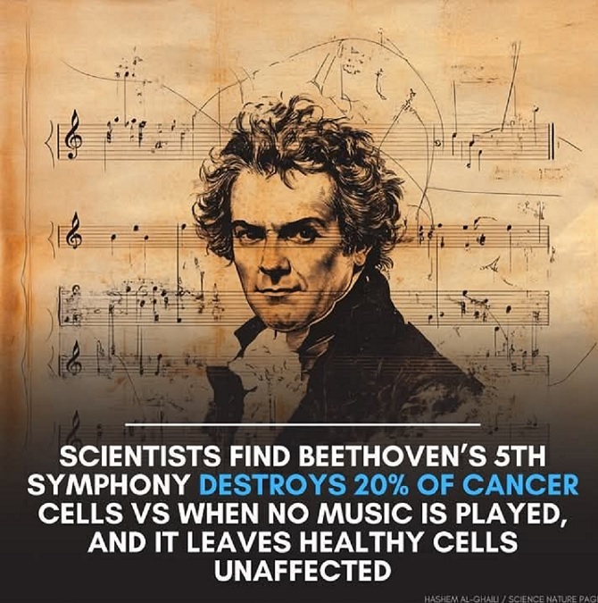அந்த ஆய்வில், மேல்நாட்டு இசை மேதை பீத்தோவனின் ஐந்தாவது எண் சிம்பொனியை இசைத்தபோது புற்றுநோய் செல்கள் 20 விழுக்காடு அழிந்து போனதை ஆய்வாளர்கள் கண்டுபிடித்திருக்கிறார்கள்.