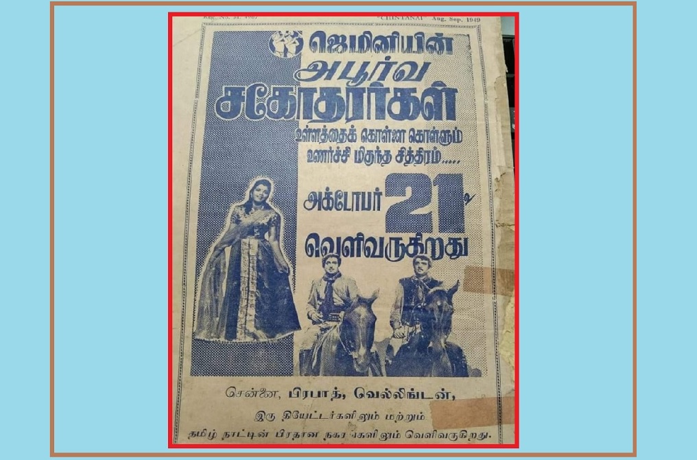 கமலின் அபூர்வ சகோதரர்கள் திரைப்படம் பலருக்கும் தெரியும். எம்.கே.ராதா நடித்து ஜெமினி ஸ்டூடியோ தயாரித்து வெளிவந்த ‘அபூர்வ சகோதரர்கள்’ படத்தின் அன்றைய விளம்பரம்.