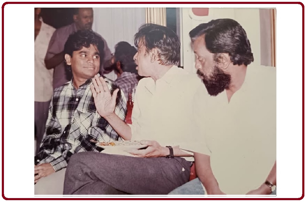 எழுத்தாளர் பாலகுமாரன், எழுத்தாளர் சுஜாதா, இசையமைப்பாளர் ஏ.ஆர்.ரஹ்மான் இவர்களுக்குப் பின்னால் அமர்ந்திருப்பது நான் (பாடலாசிரியர் முத்து வடுகு).