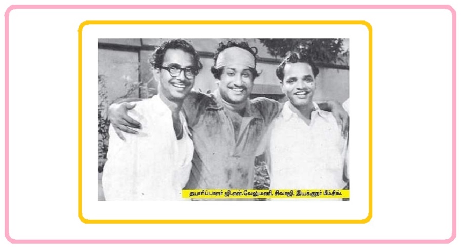 பாகப் பிரிவினை, பாலும் பழமும், படகோட்டி, பணத்தோட்டம் என்று பல முக்கியமான படங்களைத் தயாரித்தவரான ஜி.என்.வேலுமணி, ‘பீம் பாய்’ என்று சிவாஜியால் செல்லமாக அழைக்கப்பட்ட இயக்குநர் பீம்சிங் ஆகியோருடன் அன்பின் பாசத்தோடு நடிகர் திலகம் சிவாஜி கணேசன்.